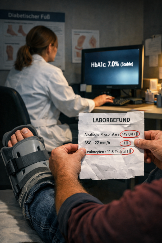 Wenn dein Fuß geschwollen ist, reicht der Blick auf den Zuckerwert (HbA1c) nicht aus. Diese drei Werte sind „stumme Zeugen“, die oft mehr über die Knochen und Entzündungen verraten als das äußere Erscheinungsbild: