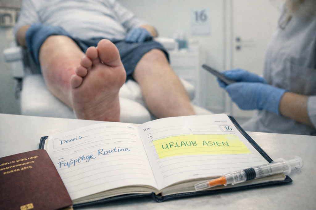 Die Reaktion meiner Podologin war rein organisatorisch. Sie hinterfragte die Reisefähigkeit bei diesem Fuß-Status nicht. Stattdessen meinte sie nur: „Dann müssen wir zusehen, dass wir den nächsten Termin zur Fußpflege unbedingt noch vor Ihrem Urlaub machen. Sonst ist die Pause einfach zu lang.“
